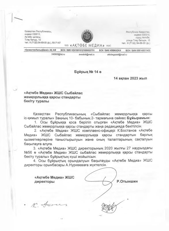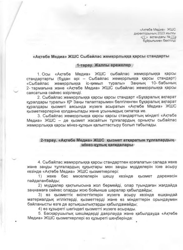 Continue Reading Previous №2 Хаттамасы — 16 маусым 2023 жылNext №3 Хаттамасы — 6 қыркүйек 2023 жыл Тағы да Коррупцияға қарсы күрес Сыбайлас жемқорлық тәуекелдеріне ішкі талдау нәтижелері бойынша анықталған, сыбайлас жемқорлық тәуекелдеріне ұшыраған лауазымдардың тізбесі Коррупцияға қарсы күрес Сыбайлас жемқорлыққа қарсы іс-қимыл жөніндегі 2025 жылға арналған іс-шаралар жоспары Коррупцияға қарсы күрес ХАБАРЛАНДЫРУ