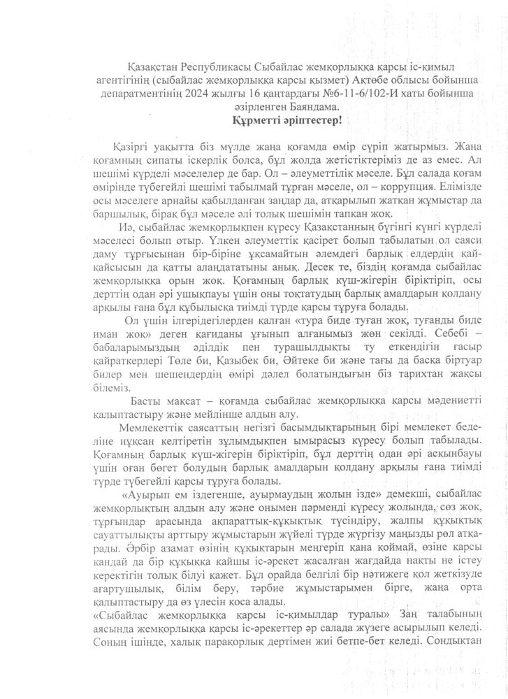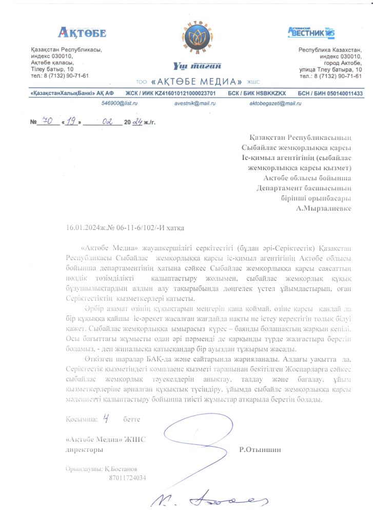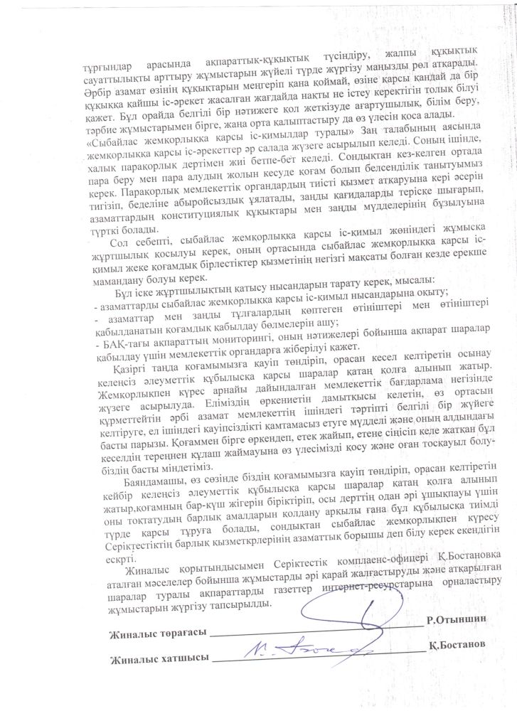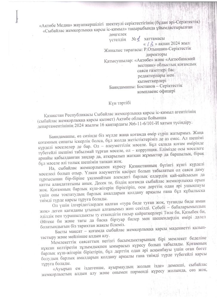 Continue Reading Previous ҚАУІПТІ ДЕРТКЕ — ҚАЖЫМАС КҮРЕС ҚАЖЕТNext «Ақтөбе Медиа» ЖШС сыбайлас жемқорлық тәуекелдеріне ішкі талдау жүргізеді Тағы да Коррупцияға қарсы күрес Сыбайлас жемқорлық тәуекелдеріне ішкі талдау нәтижелері бойынша анықталған, сыбайлас жемқорлық тәуекелдеріне ұшыраған лауазымдардың тізбесі Коррупцияға қарсы күрес Сыбайлас жемқорлыққа қарсы іс-қимыл жөніндегі 2025 жылға арналған іс-шаралар жоспары Коррупцияға қарсы күрес ХАБАРЛАНДЫРУ